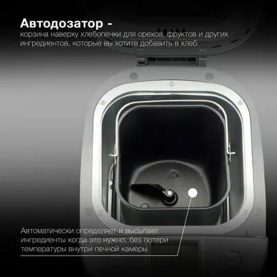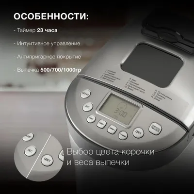 | Особенности | выбор цвета корочки, диспенсер, поддержание температуры, регулировка веса выпечки, таймер, Диспенсер для добавок, окно контроля процесса |
