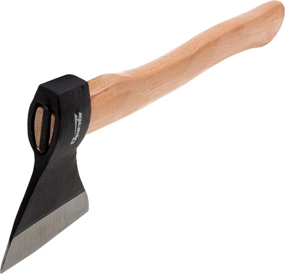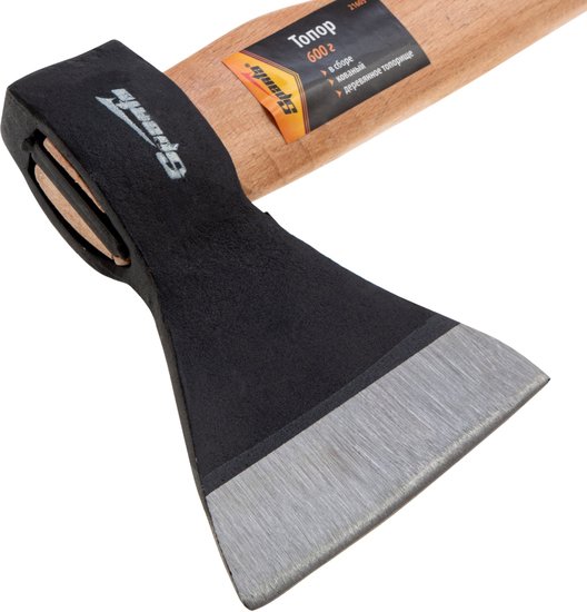 | Информация | Топор изготовлен методом свободной ковки из стали марки 45. Твердость – 50 HRC. Рукоятка инструмента изготовлена из березы. Вес с топорищем 770 г. |
