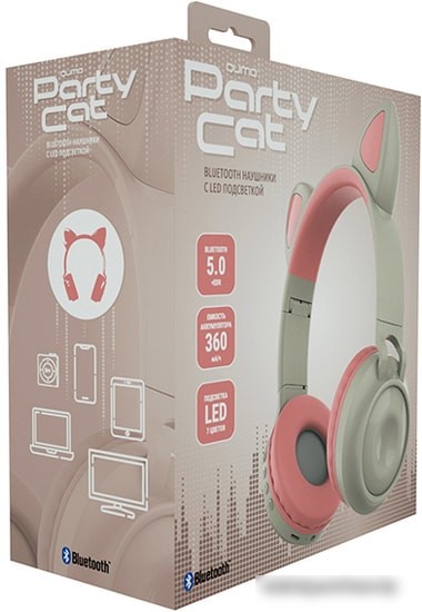| Информация | Bluetooth наушники с микрофоном Qumo Party Cat - это беспроводная полноразмерная гарнитура, с оригинальным дизайном с многоцветной подсветкой, разработанным специально для вечеринок. Для передачи сигнала используется современная версия Bluetooth 5.0. Беспроводная гарнитура Qumo Party Cat выполнена из прочного ABS пластика, что делает ее прочной и долговечной. Bluetooth гарнитура Qumo Party Cat имеет встроенный аккумулятор ёмкостью 360 мА-ч. Встроенный FM-приемник и способна автономно работать до 10 часов. |